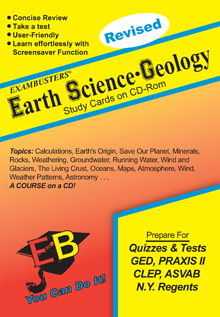 Exambusters on CD presents over 600 questions and answers written by certified teachers and college professors with a focus on exam preparation. Highlights the essential earth science and geology facts and concepts you need to know to test well. Prepare for quizzes, tests, GED, PRAXIS II, CLEP, ASVAB, and N.Y. Regents exams. Review study cards one by one and eliminate them from your stack once you've learned them. Take a sample quiz, mid-term, or final and keep track of test results as you progress. Learn subliminally with "Screen Saver Mode." Topics: Calculations, Earth's Origin, Save Our Planet, Minerals, Rocks, Weathering, Groundwater, Running Water, Wind and Glaciers, The Living Crust, Oceans, Maps, Atmosphere, Wind, Weather Patterns, Astronomy . . . A COURSE on a CD!