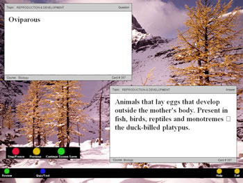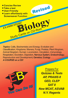 Exambusters on CD presents over 450 questions and answers written by certified teachers and college professors with a focus on exam preparation. Highlights the essential biology definitions and concepts you need to know to test well. Prepare for quizzes, tests, AP, PRAXIS II, GED, CLEP, SAT II, MCAT, ASVAB, and N.Y. Regents exams. Review study cards one by one and eliminate them from your stack once you've learned them. Take a sample quiz, mid-term, or final and keep track of test results as you progress. Learn subliminally with "Screen Saver Mode." Topics: Cells, Biochemistry and Energy; Evolution and Classification; Kingdoms: Monera, Fungi, Protista, Plant Kingdom, Animal Kingdom; Human: Locomotion, Circulation, Immunology, Respiration, Excretion, Digestion, Nervous System, Endocrinology; Reproduction and Development; Genetics; Ecology . . . A COURSE on a CD!