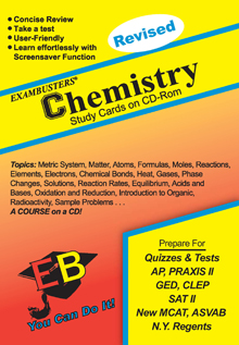 Exambusters on CD presents over 700 questions and answers written by certified teachers and college professors with a focus on exam preparation. Highlights the essential chemistry formulas and concepts you need to know to test well. Solve problems. Prepare for quizzes, tests AP, PRAXIS II, GED, CLEP, SAT II, MCAT, ASVAB, and N.Y. Regents exams. Review study cards one by one and eliminate them from your stack once you've learned them. Take a sample quiz, mid-term, or final and keep track of test results as you progress. Learn subliminally with "Screen Saver Mode." Topics: Metric System, Matter, Atoms, Formulas, Moles, Reactions, Elements, Electrons, Chemical Bonds, Heat, Gases, Phase Changes, Solutions, Reaction Rates, Equilibrium, Acids and Bases, Oxidation and Reduction, Introduction to Organic, Radioactivity, Sample Problems . . . A COURSE on a CD!