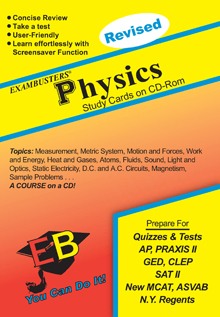 Exambusters on CD presents over 600 questions and answers written by certified teachers and college professors with a focus on exam preparation. Highlights the essential physics formulas and concepts you need to know to test well. Solve problems. Prepare for quizzes, tests, AP, PRAXIS II, GED, CLEP, SAT II, MCAT, ASVAB, and N.Y. Regents exams. Review study cards one by one and eliminate them from your stack once you've learned them. Take a sample quiz, mid-term, or final and keep track of test results as you progress. Learn subliminally with "Screen Saver Mode." Topics: Measurement, Metric System, Motion and Forces, Work and Energy, Heat and Gases, Atoms, Fluids, Sound, Light and Optics, Static Electricity, D.C. and A.C. Circuits, Magnetism, Sample Problems . . . A COURSE on a CD!