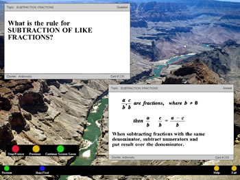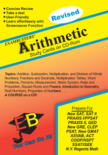Exambusters on CD presents over 600 questions and answers written by certified teachers with a focus on exam preparation. Highlights the essential arithmetic definitions, problems, and concepts you need to know to test well. Prepare for New SAT, SAT II, PRAXIS I/PPSAT, PRAXIS II, GED, GRE, CLEP, PSAT, GMAT, ASVAB, ACT, COOP/HSPT, SSAT/ISEE, and New York Regents Math. Review study cards one by one and eliminate them from your stack once you've learned them. Take a sample quiz, mid-term, or final and keep track of test results as you progress. Learn subliminally with "Screen Saver Mode." Topics: Addition, Subtraction, Multiplication, and Division of Whole Numbers; Fractions and Decimals, Multiplication Tables, Word Problems, Percents, Measurement, Metric System, Ratio and Proportion, Square Roots and Powers, Introduction to Geometry, Real Numbers, Properties of Numbers . . . A COURSE on a CD!