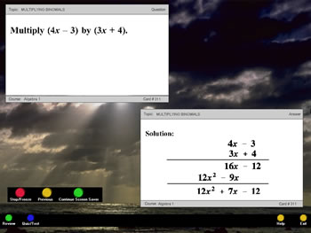 Exambusters on CD presents over 450 questions and answers written by certified teachers with a focus on exam preparation. Highlights the essential introductory algebra definitions, problems, and concepts you need to know to test well. Prepare for quizzes, tests, New SAT, SAT II, PRAXIS I/PPSAT, PRAXIS II, GED, GRE, CLEP, PSAT, GMAT, ASVAB, ACT, COOP/HSPT, SSAT/ISEE, and New York Regents Math. Review study cards one by one and eliminate them from your stack once you've learned them. Take a sample quiz, mid-term, or final and keep track of test results as you progress. Learn subliminally with "Screen Saver Mode." Topics: Algebraic Concepts, Sets, Variables, Exponents, Properties of Numbers, Simple Equations, Signed Numbers, Monomials, Polynomials, Additive and Multiplicative Inverse, Word Problems, Prime Numbers, Factoring, Algebraic Fractions, Ratio and Proportion, Variation, Radicals, Introduction to Quadratic Equations, Coordinate Geometry . . . A COURSE on a CD!