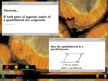 Exambusters on CD presents over 450 questions and answers written by certified teachers with a focus on exam preparation. Highlights the essential geometry theorems, concepts, and definitions you need to know to test well. Prepare for quizzes, tests, New SAT, SAT II, PRAXIS I/PPSAT, PRAXIS II, GED, GRE, CLEP, PSAT, GMAT, ASVAB, COOP/HSPT, ACT, and New York Regents Math. Review study cards one by one and eliminate them from your stack once you've learned them. Take a sample quiz, mid-term, or final and keep track of test results as you progress. Learn subliminally with "Screen Saver Mode." Topics: Lines and Angles, Triangles, Proofs, Congruent Triangles, Perpendicular Lines, Parallel Lines, Angle Sums, Quadrilaterals, Medians, Altitudes and Bisectors, Circles, Ratio and Proportion, Similar Polygons, Proportions in Right Triangles, Areas of Polygons, Circles and Regular Polygons, Inequalities, Locus, Coordinate Geometry . . . A COURSE on a CD!