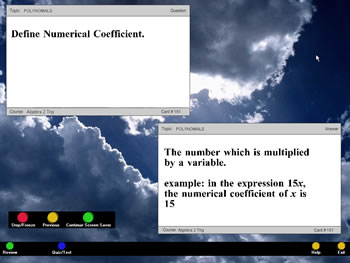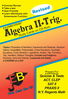 Exambusters on CD presents over 500 questions and answers written by certified teachers and college professors with a focus on exam preparation. Highlights essential intermediate algebra and trigonometry definitions, problems, and concepts you need to know to test well. Prepare for quizzes, tests, ACT, CLEP, SAT II, PRAXIS II, and N.Y. Regents Math. Review study cards one by one and eliminate them from your stack once you've learned them. Take a sample quiz, mid-term, or final and keep track of test results as you progress. Learn subliminally with "Screen Saver Mode." Topics: Properties of Numbers, Exponents and Radicals, Absolute Values, Inequalities, Polynomials, Linear Equations, Quadratic Equations, Conic Sections, Logarithms, Angles, Trig. Functions, Trig. Identities, Oblique Triangles, Complex and Imaginary Numbers, Area and Volume, Sequences and Series . . . A COURSE on a CD!