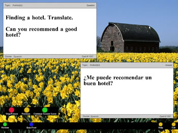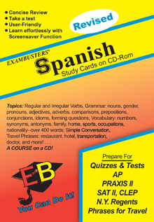 Exambusters on CD presents over 2100 questions and answers written by certified teachers and professional translators with a focus on exam preparation. Highlights essentials you need to know to test well. A review of Spanish grammar, vocabulary and phrases. Prepare for quizzes, tests, AP, PRAXIS II, SAT II, CLEP, and N.Y. Regents Level I-III. Perfect for travelers too! Review study cards one by one and eliminate them from your stack once you've learned them. Take a sample quiz, mid-term, or final and keep track of test results as you progress. Learn subliminally with "Screen Saver Mode." Topics: Regular and Irregular Verbs, Grammar: nouns, gender, pronouns, adjectives, adverbs, comparisons, prepositions, conjunctions, idioms, forming questions; Vocabulary: numbers, synonyms, antonyms, family, home, sports, occupations, nationality--over 400 words; Simple Conversation, Travel Phrases: restaurant, hotel, transportation, doctor, and more! . . . A COURSE on a CD!