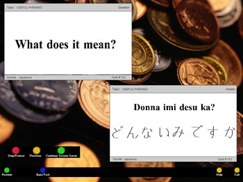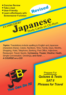 Exambusters on CD presents over 900 questions and answers written by certified teachers and professional translators with a focus on exam preparation. Highlights essential Japanese words and phrases. Both Japanese characters (Kana) and easy pronunciation are included. Prepare for quizzes, tests, and the SAT II exam. Restaurant, hotel, etc. phrases make them perfect for travelers too! Review study cards one by one and eliminate them from your stack once you've learned them. Take a sample quiz, mid-term, or final and keep track of test results as you progress. Learn subliminally with "Screen Saver Mode." Topics: Translations include spelling in English and Japanese characters (Kana). Colors, Numbers, Time, Family, Days, Months, Shopping, Hotel, Telephone, Banking, Post Office, Adjectives, Restaurant, Travel, Sports, Sightseeing, Theater, Weather, Health, Simple Conversation, Greetings, and more! . . . A COURSE on a CD!