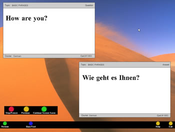 Exambusters on CD presents over 1100 questions and answers written by certified teachers and professional translators with a focus on exam preparation. Highlights essential German words and phrases you need to know to test well. Prepare for quizzes, tests, AP, SAT II, CLEP, PRAXIS II, and N.Y. Regents Level I-III. Restaurant, hotel, etc. phrases make them perfect for travelers too! Review study cards one by one and eliminate them from your stack once you've learned them. Take a sample quiz, mid-term, or final and keep track of test results as you progress. Learn subliminally with "Screen Saver Mode." Topics: Sports, Shopping, Entertainment, Hobbies, Plant Life, Lakes and Oceans, Animals, Weather, Dining Out, Food, Beverages, Sightseeing, Transportation, Currency, Customs, Safety, Health, Time, Emergency, Meeting New People, Numbers, Clothing, Home, Office, Buildings, Technology, Relationships, Occupations, Hotel, Government, Religion, Education, Simple Phrases, and more! . . . A COURSE on a CD!
