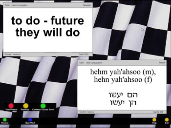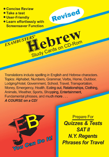 Exambusters on CD presents over 1800 questions and answers written by certified teachers and professional translators with a focus on exam preparation. Highlights essential Hebrew words and phrases you need to know to test well. Both Hebrew characters and easy pronunciation are included. Prepare for quizzes, tests, New York Regents Level I-III, and SAT II exams. Perfect for Travelers too! Review study cards one by one and eliminate them from your stack once you've learned them. Take a sample quiz, mid-term, or final and keep track of test results as you progress. Learn subliminally with "Screen Saver Mode." Translations include spelling in English and Hebrew characters. Topics: Alphabet, Numbers, Grammar, Verbs, Home, Outdoor, Lodging/Hotel, Government, School, Travel, Transportation, Money, Emergency, Health, Eating out, Relationships, Clothing, Animals, Weather, Sports, Shopping, Entertainment, Fundamental phrases, and much more . . . A COURSE on a CD!