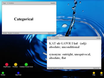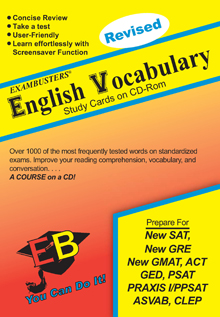 Exambusters on CD presents over 1000 essential English Vocabulary words that you need to know to test well. Written by professional exam coaches and certified teachers. Perfect for anyone who wants to enrich their vocabulary! Prepare for the New SAT, GRE, GMAT, ACT, GED, ASVAB, CLEP, PSAT, and PRAXIS I/PPSAT. Review study cards one by one and eliminate them from your stack once you've learned them. Take a sample quiz, mid-term, or final and keep track of test results as you progress. Learn subliminally with "Screen Saver Mode." Over 1000 of the most frequently tested words on standardized exams. Improve your reading comprehension, vocabulary, and conversation. . . . A COURSE on a CD!
