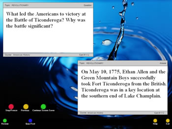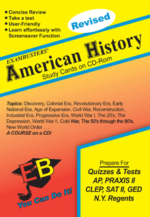 Exambusters on CD presents over 800 questions and answers written by certified teachers and college professors with a focus on exam preparation. Highlights the essential American history people, dates, and events you need to know to test well. Prepare for quizzes, tests, AP, PRAXIS II, CLEP, SAT II, GED, and N.Y. Regents exams. Review study cards one by one and eliminate them from your stack once you've learned them. Take a sample quiz, mid-term, or final and keep track of test results as you progress. Learn subliminally with "Screen Saver Mode." Topics: Discovery, Colonial Era, Revolutionary Era, Early National Era, Age of Expansion, Civil War, Reconstruction, Industrial Era, Progressive Era, World War I, The 20's, The Depression, World War II, Cold War, The 50's through the 80's, New World Order . . . A COURSE on a CD!