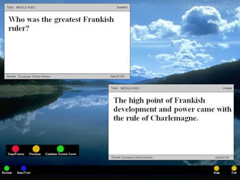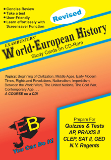Exambusters on CD presents over 650 questions and answers written by certified teachers and college professors with a focus on exam preparation. Highlights the essential World/European History dates, events, and facts you need to know to test well. Prepare for quizzes, tests, AP, PRAXIS II, CLEP, SAT II, GED, and N.Y. Regents exams. Review study cards one by one and eliminate them from your stack once you've learned them. Take a sample quiz, mid-term, or final and keep track of test results as you progress. Learn subliminally with "Screen Saver Mode." Topics: Beginning of Civilization, Middle Ages, Early Modern Times, Rights and Revolutions, Nationalism, Imperialism, Between the World Wars, The United Nations, The Cold War, Contemporary Age . . . A COURSE on a CD!