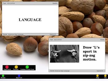 Written by college professors and professional interpreters, Exambusters on CD presents over 550 study cards focusing on fundamental signs. Learn with Photographs of each hand shape. Develop your American Sign Language (ASL) skills quickly and begin communicating today! Students: Prepare for quizzes and tests too! Review study cards one by one and eliminate them from your stack once you've learned them. Take a sample quiz, mid-term, or final and keep track of test results as you progress. Learn subliminally with "Screen Saver Mode." Topics: Alphabet, Numbers, Family, Emotions, Food, Questions, Holidays, Seasons, Days, Months, Outdoors, Education, Vacation, Relaxation, Money, Around the Globe, Occupations, Conversation, Colors, and much, much more . . . A COURSE on a CD!